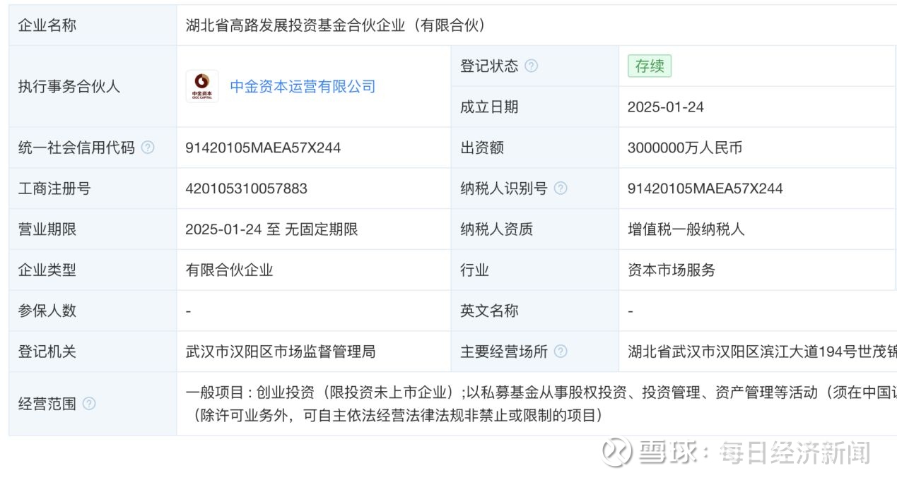 公开资料显示,该基金由湖北交通投资集团有限公司与中金资本联合发起设立,其中湖北交通投资集团认缴出资299.99亿元、出资比例99.9967%,中金资本认缴出资300万元、出资比例0.0033%,由中金资本担任管理人。该基金上半年已完成募集,总规模300亿元。