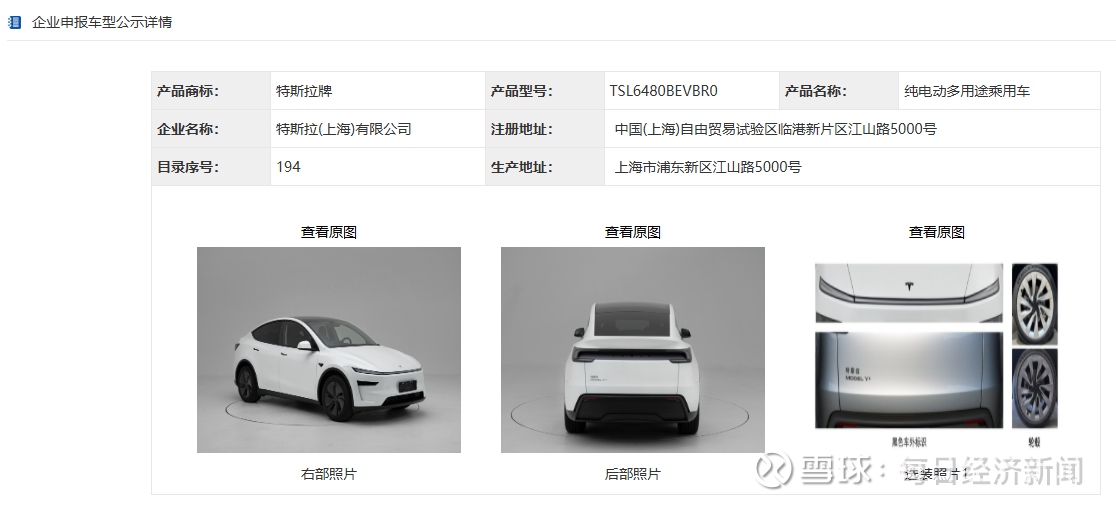 10月9日,工信部发布第400批《道路机动车辆生产企业及产品公告》新产品公示,特斯拉Model Y出现在本次公示中。根据公示信息,该车型搭载三元锂离子电池组与3D6电机,与当前Model 3后驱长续航版配置相同。业内认为,该款车型是与Model 3后驱长续航版一样的版本。