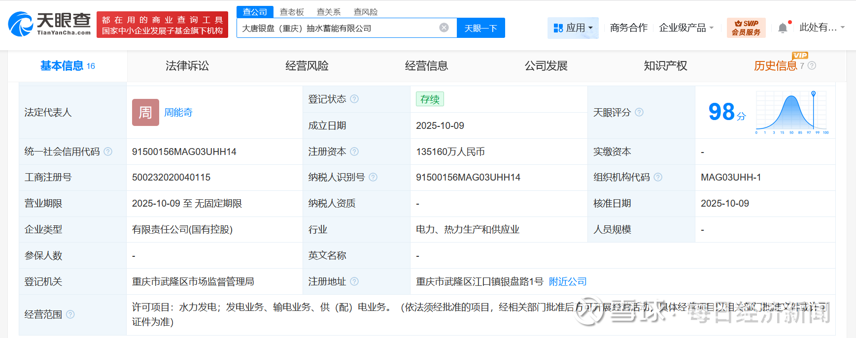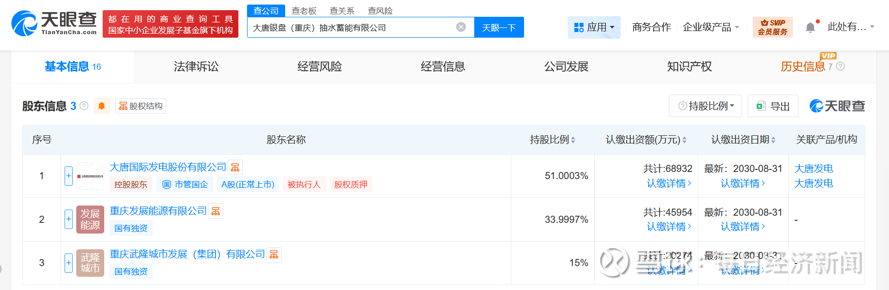 每经AI快讯,天眼查工商信息显示,近日,大唐银盘(重庆)抽水蓄能有限公司成立,法定代表人为周能奇,注册资本约13.5亿元人民币,经营范围为水力发电,发电业务、输电业务、供(配)电业务。股东信息显示,该公司由大唐发电(601991)、重庆发展能源有限公司、重庆武隆城市发展(集团)有限公司共同持股。