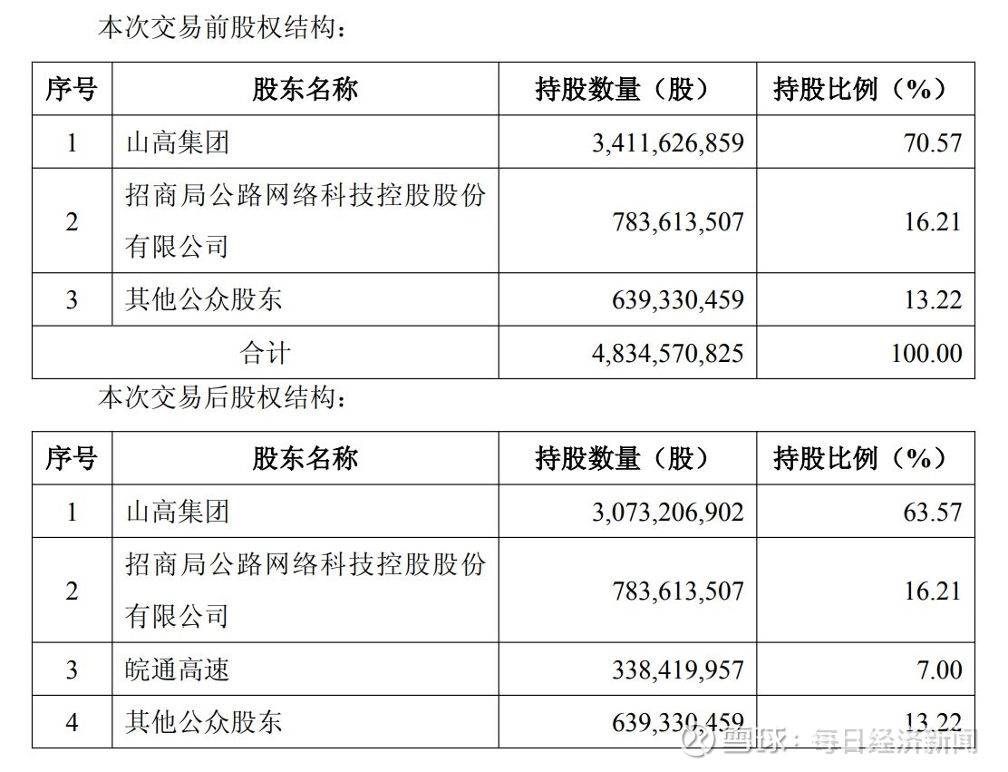 本次交易前,山高集团持有山东高速34.12亿股,占总股本的70.57%,为控股股东。皖通高速未持有山东高速股份。
