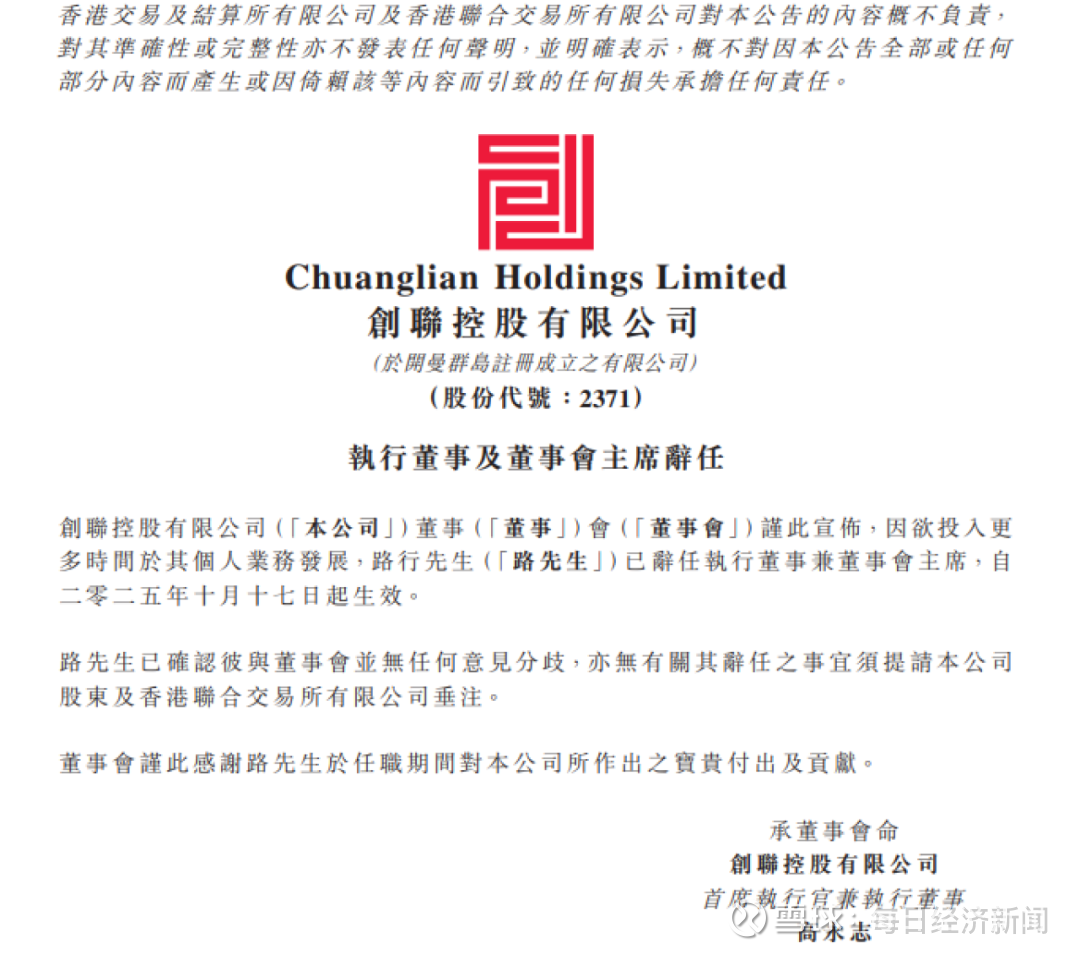 10月17日,创联控股有限公司(创联控股,02371.HK)公告执行董事及董事会主席辞任。公告称,路行因欲投入更多时间于其个人业务发展,已辞任创联控股有限公司执行董事兼董事会主席,辞任自2025年10月17日起生效。