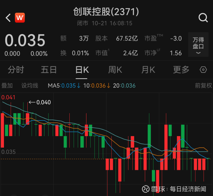 截至10月17日收盘,创联控股股价仅0.035港元,总市值缩水至2.36亿港元。