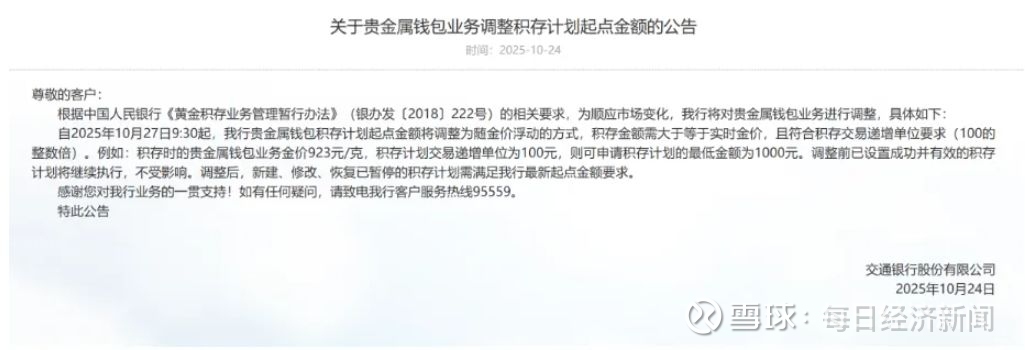 10月24日,交通银行发布公告称,为顺应市场变化,自10月27日9:30起,该行贵金属钱包积存计划起点金额将调整为随金价浮动的方式,积存金额需大于等于实时金价,且符合积存交易递增单位要求(100的整数倍)。