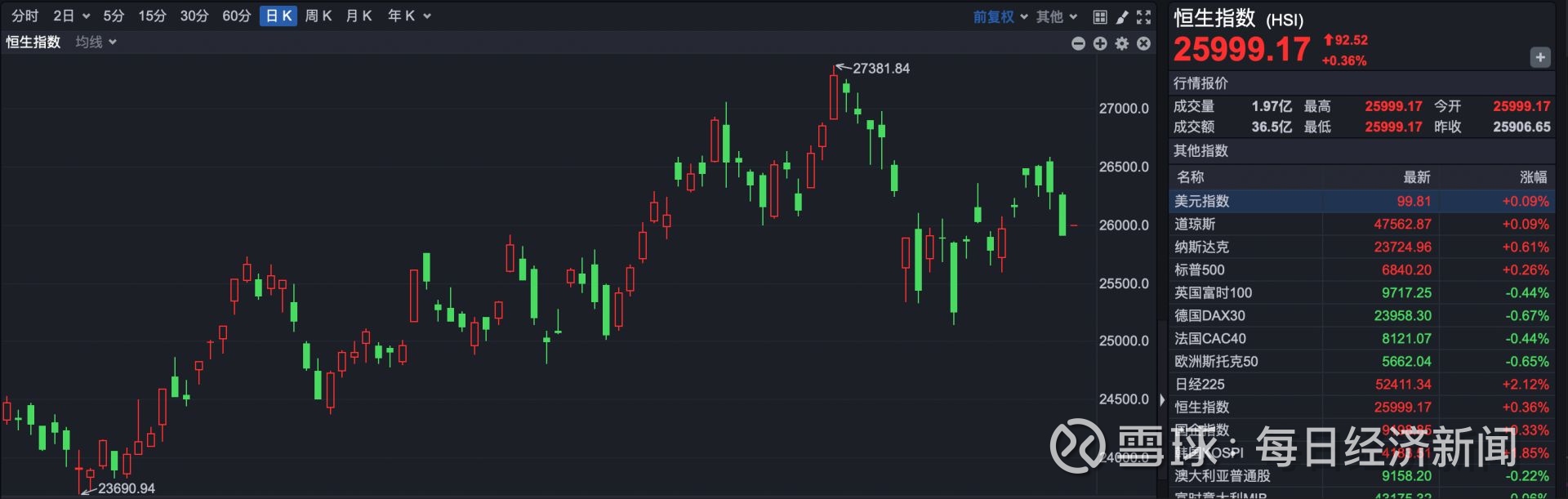 截至发稿,恒生指数开盘报25999.17点,上涨92.52点,涨幅0.36%。