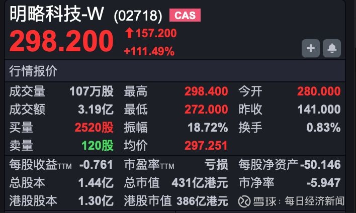 新股方面,明略科技-W(02718.HK)上市交易,早间高开98%,随后股价短线拉升。截至发稿,明略科技最高报298港元,涨幅111.35%。