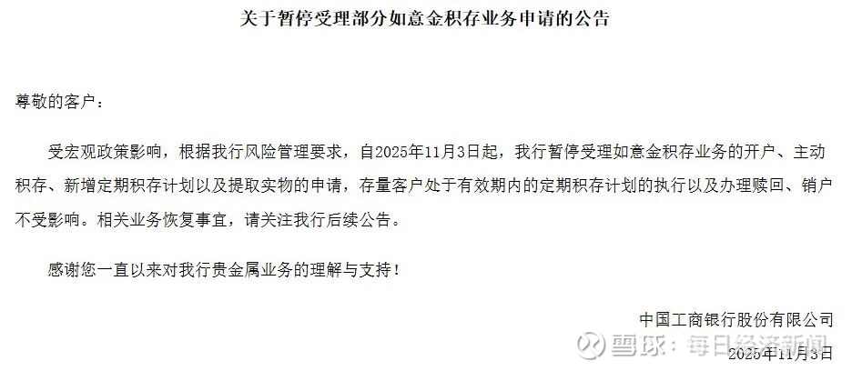 此前,工商银行同日发布公告称,受宏观政策影响,根据本行风险管理要求,自2025年11月3日起,暂停受理如意金积存业务的开户、主动积存、新增定期积存计划以及提取实物的申请,存量客户处于有效期内的定期积存计划的执行以及办理赎回、销户不受影响。相关业务恢复事宜,请关注后续公告。