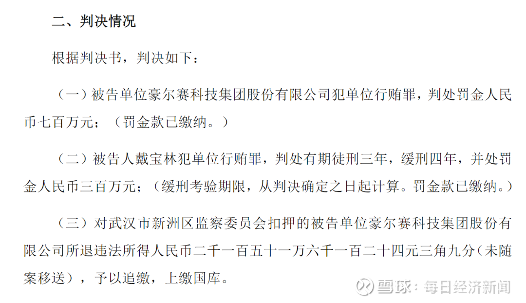 11月5日,豪尔赛(002963.SZ)公告称,公司因犯单位行贿罪被罚700万元,追缴违法所得2152万元。