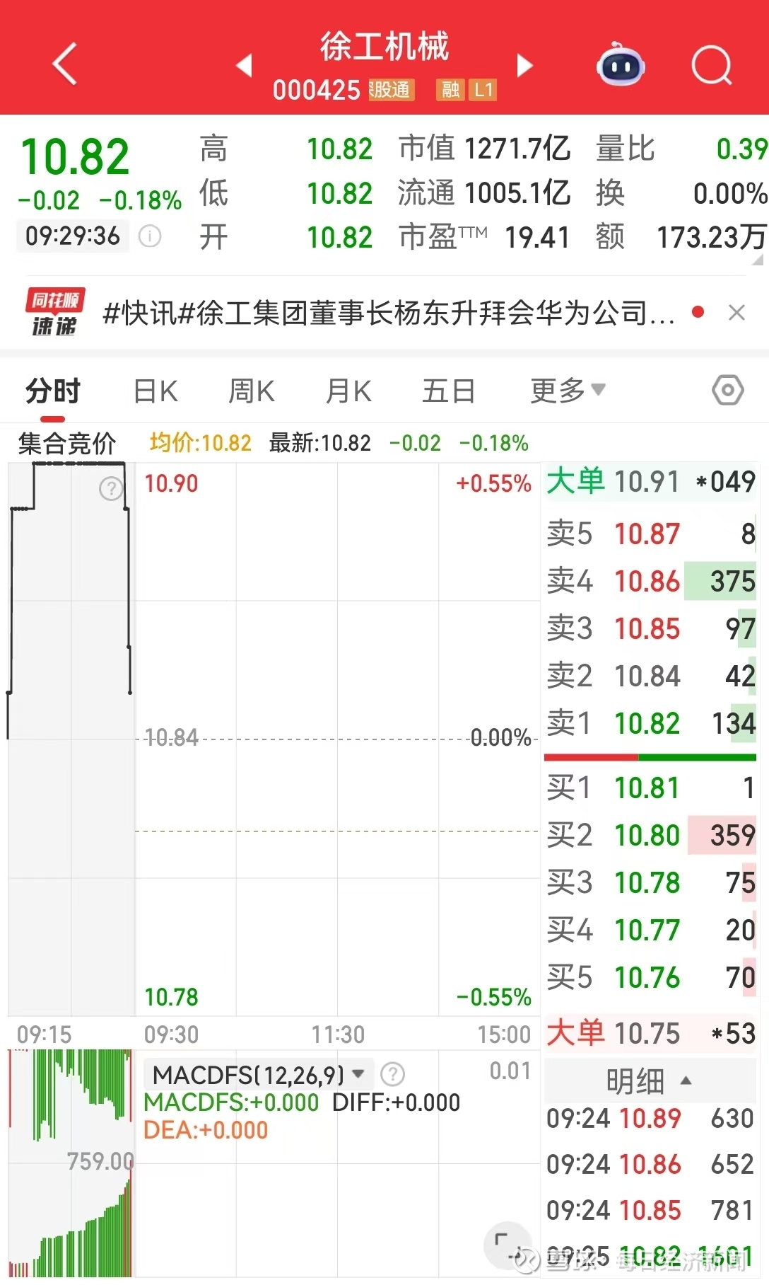 截至11月7日发稿,徐工机械(SH000425)报10.82元,跌幅0.18%,市值1271.7亿元。