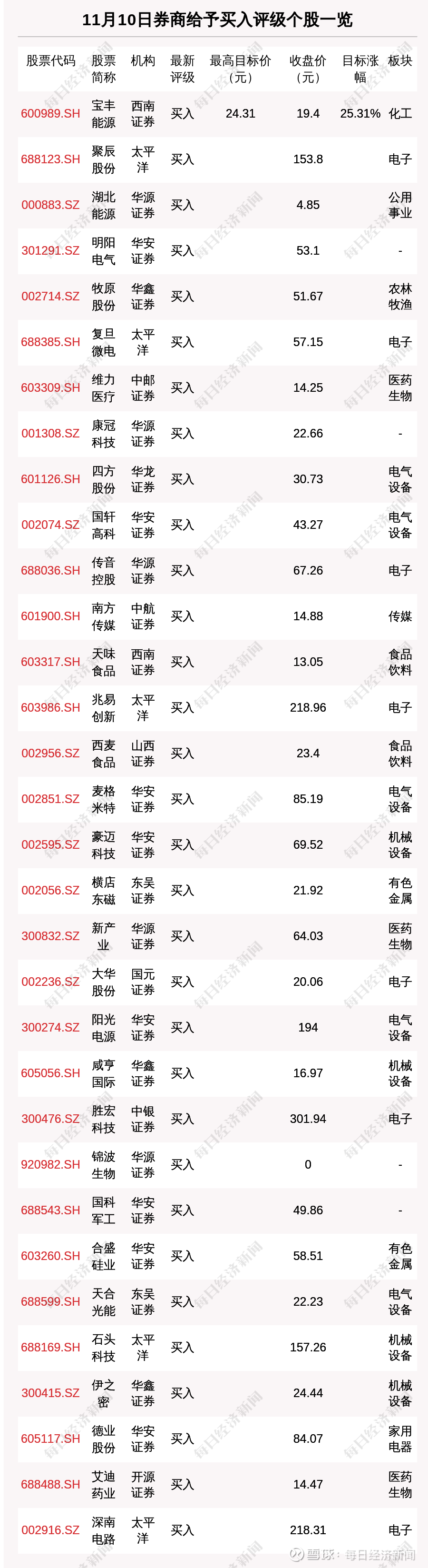每经AI快讯,11月10日,券商给予评级的个股数共有68只,获得买入评级的个股数共有32只。在公布了目标价格的1只个股中,按照最新收盘价计算,预期涨幅排名居前的个股是宝丰能源(600989.SH),预期涨幅是25.31%。