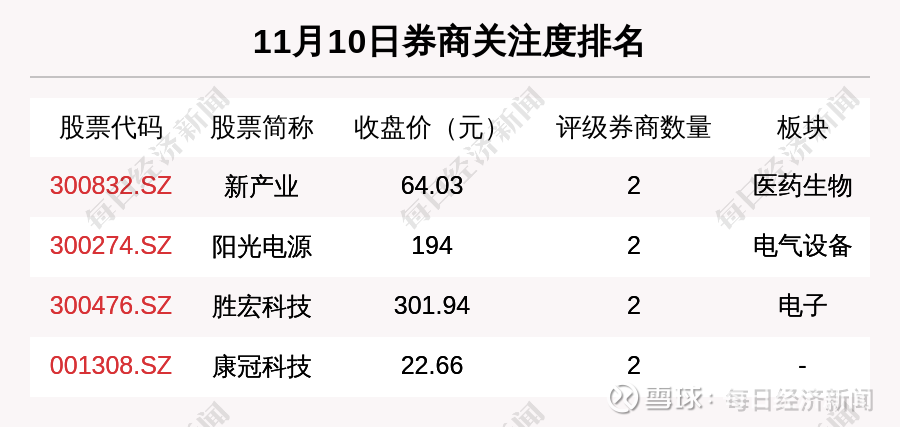 从券商对个股的关注程度来看,有4只个股获得多家券商关注,券商关注数量排名居前的个股是新产业(300832.SZ)、阳光电源(300274.SZ)、胜宏科技(300476.SZ)。