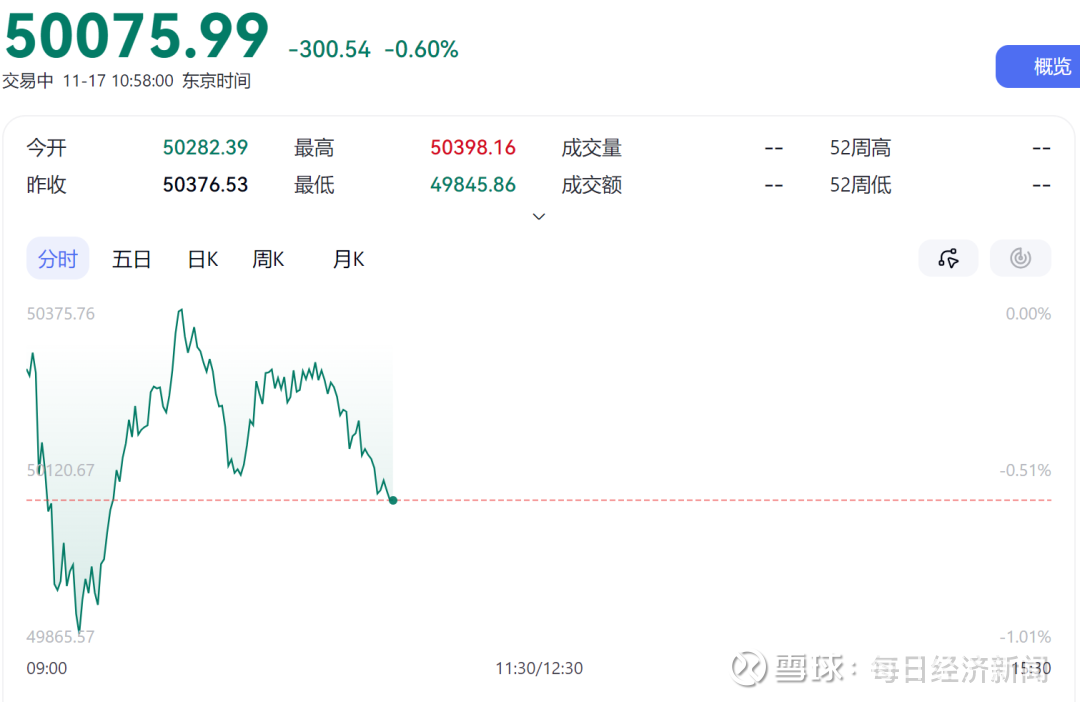17日,日经225开盘跳水,一度跌超1%跌破50000点,截至9:50左右,跌幅收窄。