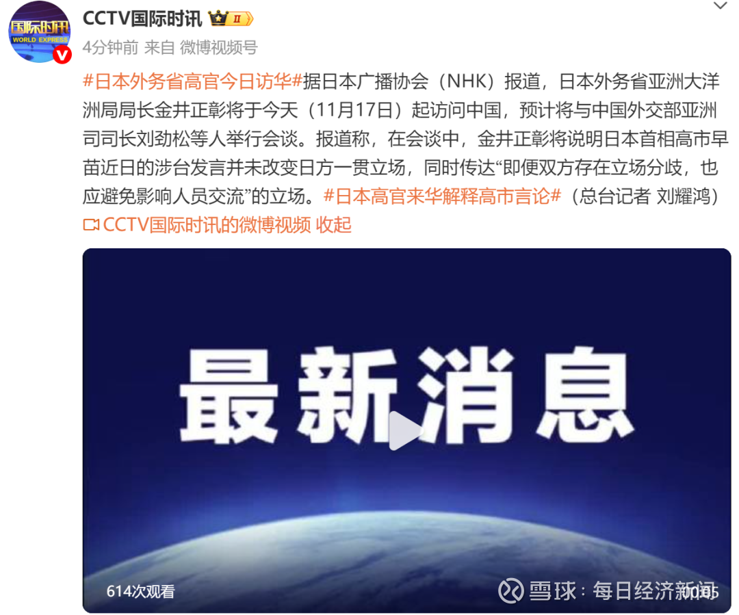 据日本广播协会(NHK)报道,日本外务省亚洲大洋洲局局长金井正彰将于今天(11月17日)起访问中国,预计将与中国外交部亚洲司司长刘劲松等人举行会谈。报道称,在会谈中,金井正彰将说明日本首相高市早苗近日的涉台发言并未改变日方一贯立场,同时传达“即便双方存在立场分歧,也应避免影响人员交流”的立场。