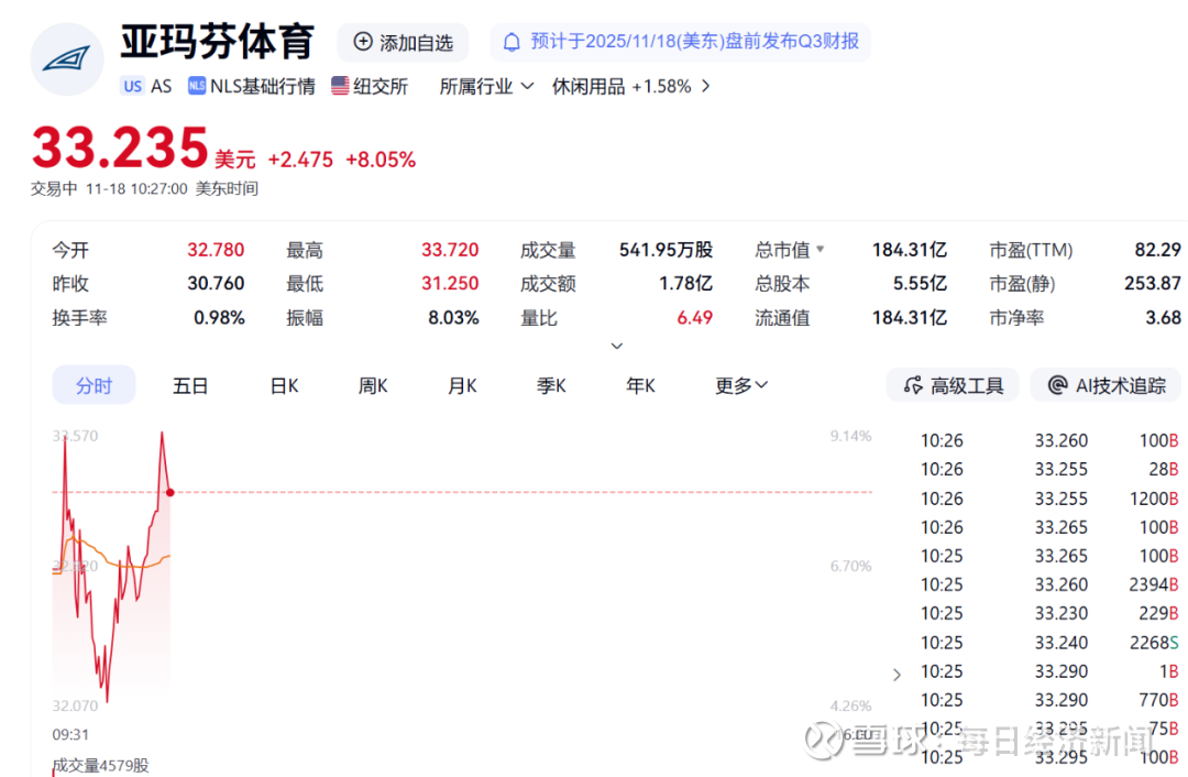 受利好业绩刺激,18日亚玛芬体育美股大涨,截至发稿,涨幅超8%,目前总市值184亿美元。尽管今夜大涨,但自9月19日以来,其股价累计跌幅仍高达13.09%。