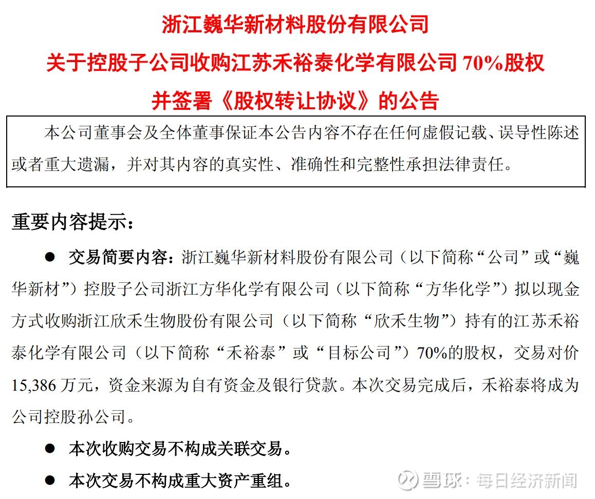11月18日晚间,巍华新材(SH603310,股价17.96元,市值62.02亿元)公告称,公司控股子公司浙江方华化学有限公司(以下简称“方华化学”)拟以1.54亿元收购浙江欣禾生物股份有限公司(以下简称“欣禾生物”)持有的江苏禾裕泰化学有限公司(以下简称禾裕泰)70%的股权。