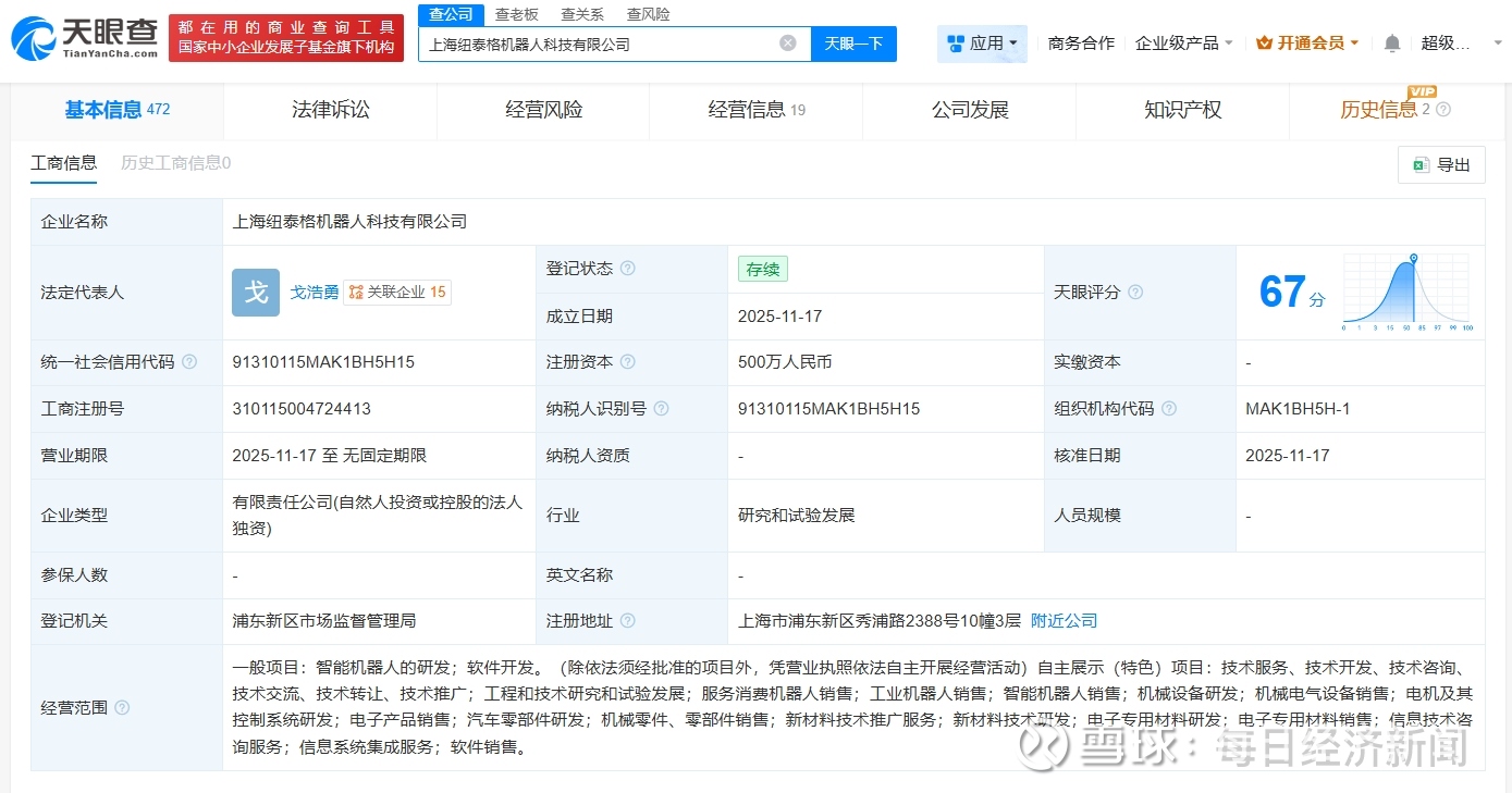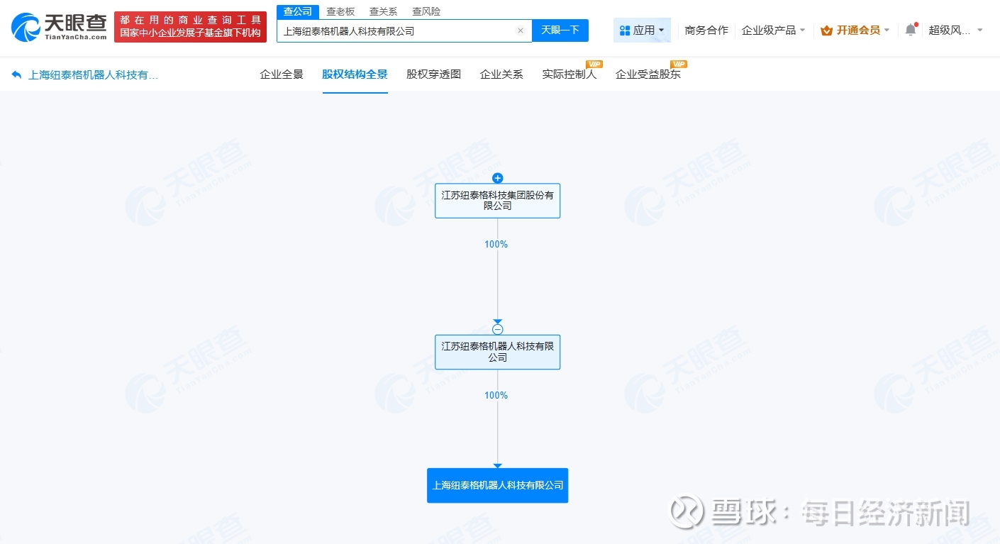 每经AI快讯,天眼查App显示,近日,上海纽泰格机器人科技有限公司成立,法定代表人为戈浩勇,注册资本500万元人民币,经营范围包括智能机器人的研发、工程和技术研究和试验发展、服务消费机器人销售、工业机器人销售等。股权全景穿透图显示,该公司由纽泰格(301229)旗下江苏纽泰格机器人科技有限公司全资持股。