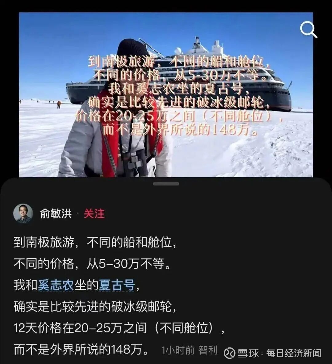 11月20日,新东方董事长俞敏洪在社交平台发文,回应到南极坐邮轮的费用“到南极坐邮轮花148万”:到南极旅游,不同的船和舱位,不同的价格,从5-30万不等,我和奚志农坐的夏古号,确实是比较先进的破冰级邮轮,12天价格在20-25万之间(不同舱位),而不是外界所说的148万。