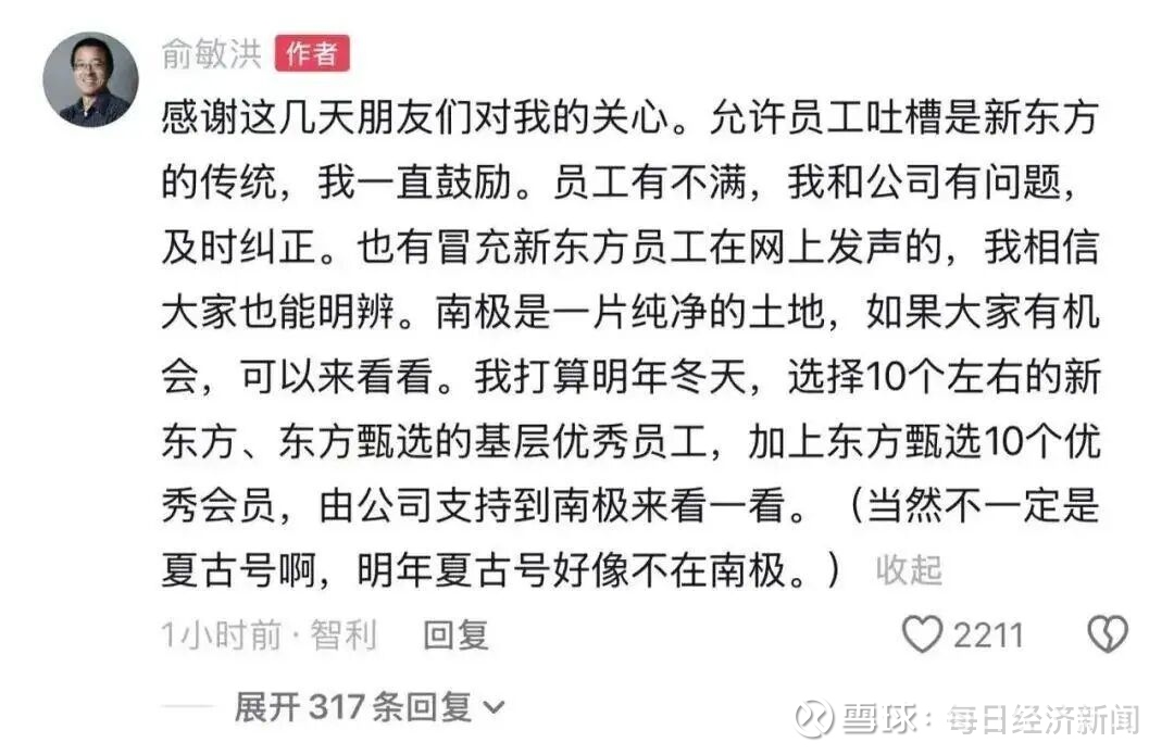 俞敏洪还发文回应:感谢这几天朋友们对我的关心。允许员工吐槽是新东方的传统,我一直鼓励。员工有不满,我和公司有问题,及时纠正。也有冒充新东方员工在网上发声的,我相信大家也能明辨。南极是一片纯净的土地,如果大家有机会,可以来看看。我打算明年冬天,选择10个左右的新东方、东方甄选的基层优秀员工,加上东方甄选10个优秀会员,由公司支持到南极来看一看。(当然不一定是夏古号啊,明年夏古号好像不在南极。)