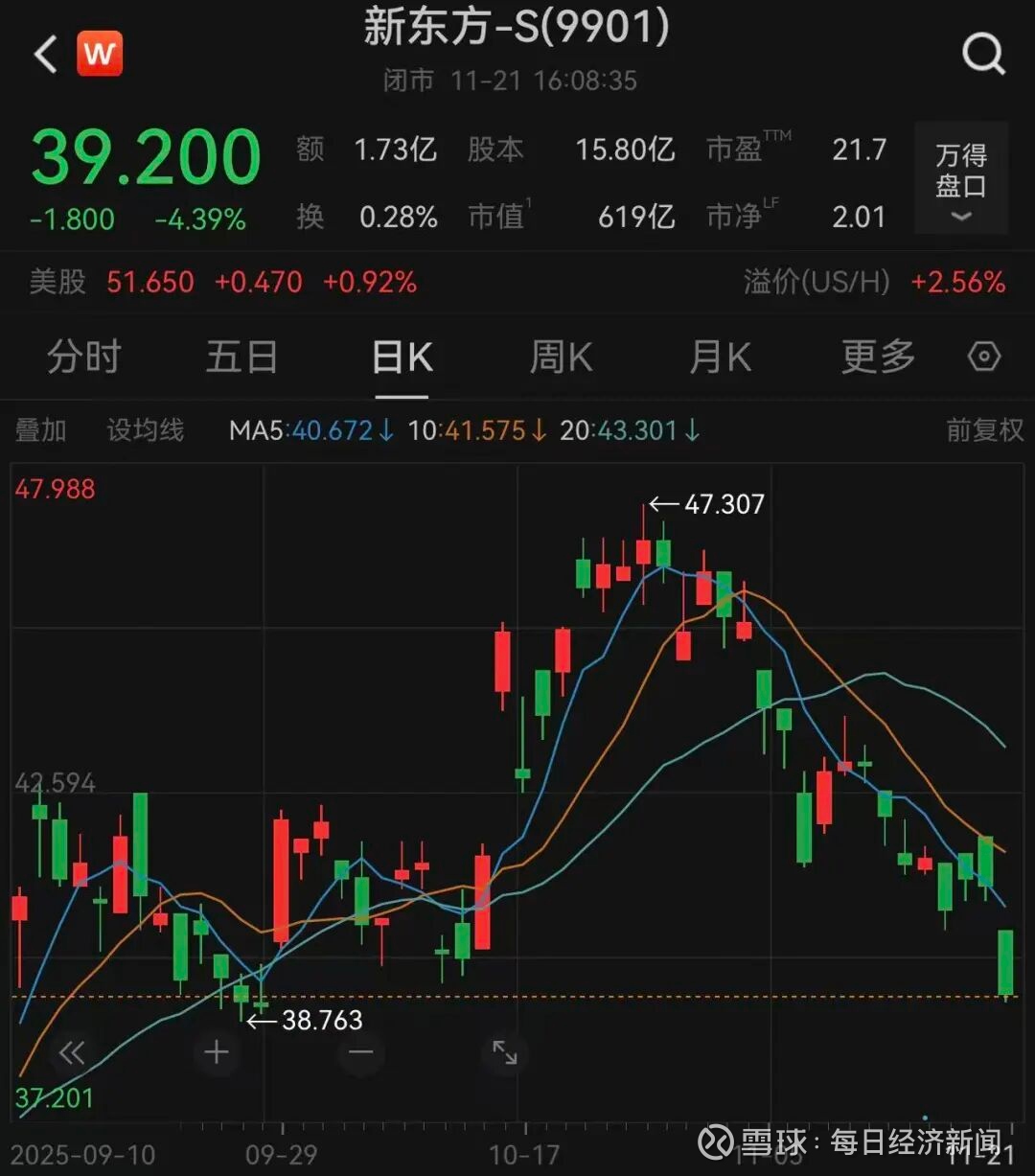 二级市场上,港股新东方自风波以来,股价已连跌4日,截至11月21日收盘,股价收跌4.39%,报39.2港元,最新市值为619亿港元。