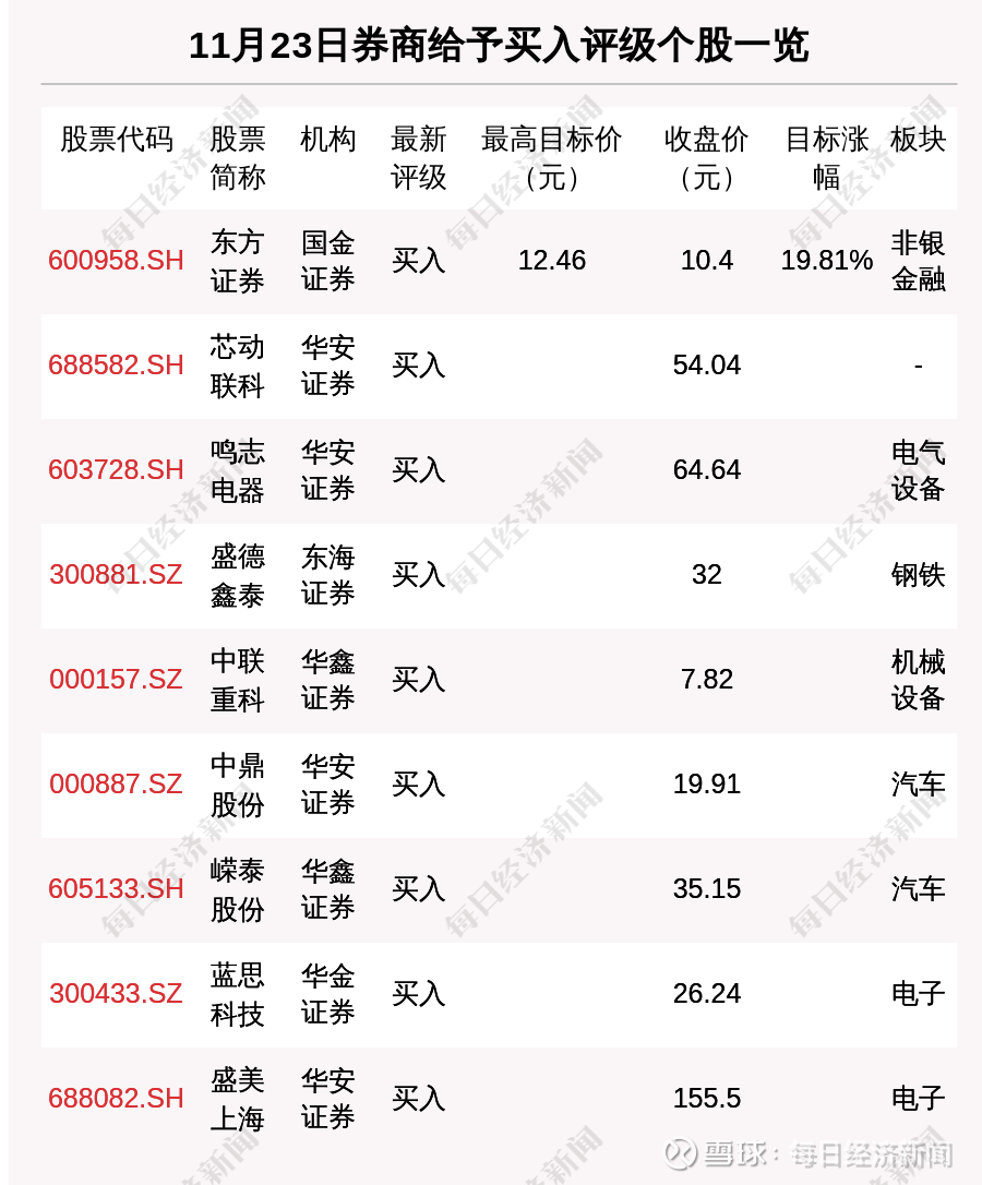 每经AI快讯,11月23日,券商给予评级的个股数共有15只,获得买入评级的个股数共有9只。在公布了目标价格的1只个股中,按照最新收盘价计算,预期涨幅排名居前的个股是东方证券(600958.SH),预期涨幅是19.81%。