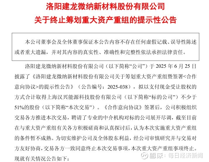 11月26日,建龙微纳(688357.SH,股价34元,市值34.02亿元)公告称,公司原拟以支付现金受让股权的方式合计取得上海汉兴能源科技股份有限公司不少于51%的股份。《合作意向协议》签署后,公司积极组织交易各方推进本次交易,聘请了专业的中介机构对标的公司展开尽调,截至目前在与重大资产重组有关各方积极磋商和认真探讨后,认为本次实施重大资产重组的条件暂不成熟。