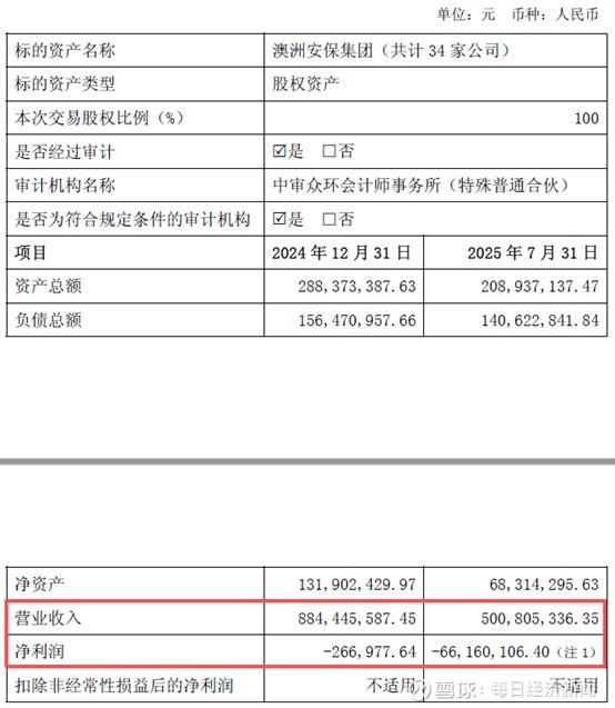 公告显示,澳洲安保集团2024年营收约8.84亿元,净亏损26.7万元;2025年前七个月实现营收约5亿元,净亏损6616万元。而对于标的今年前七个月亏损扩大,中安科称,是由于澳洲安保集团于今年3月31日豁免了对香港母公司的其他应收款1171.67万澳元(合人民币5417.57万元)。