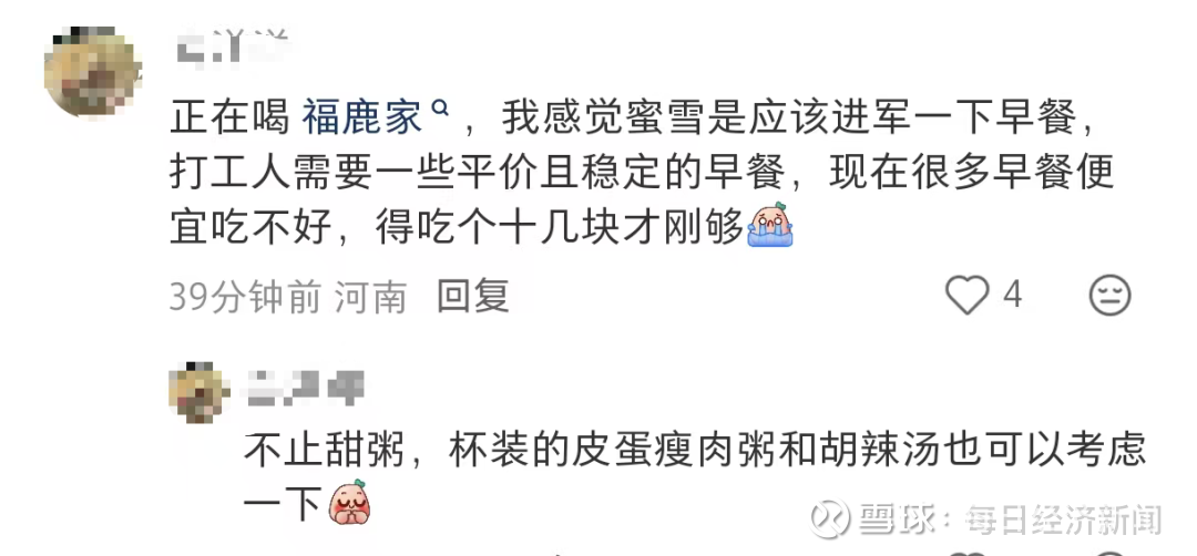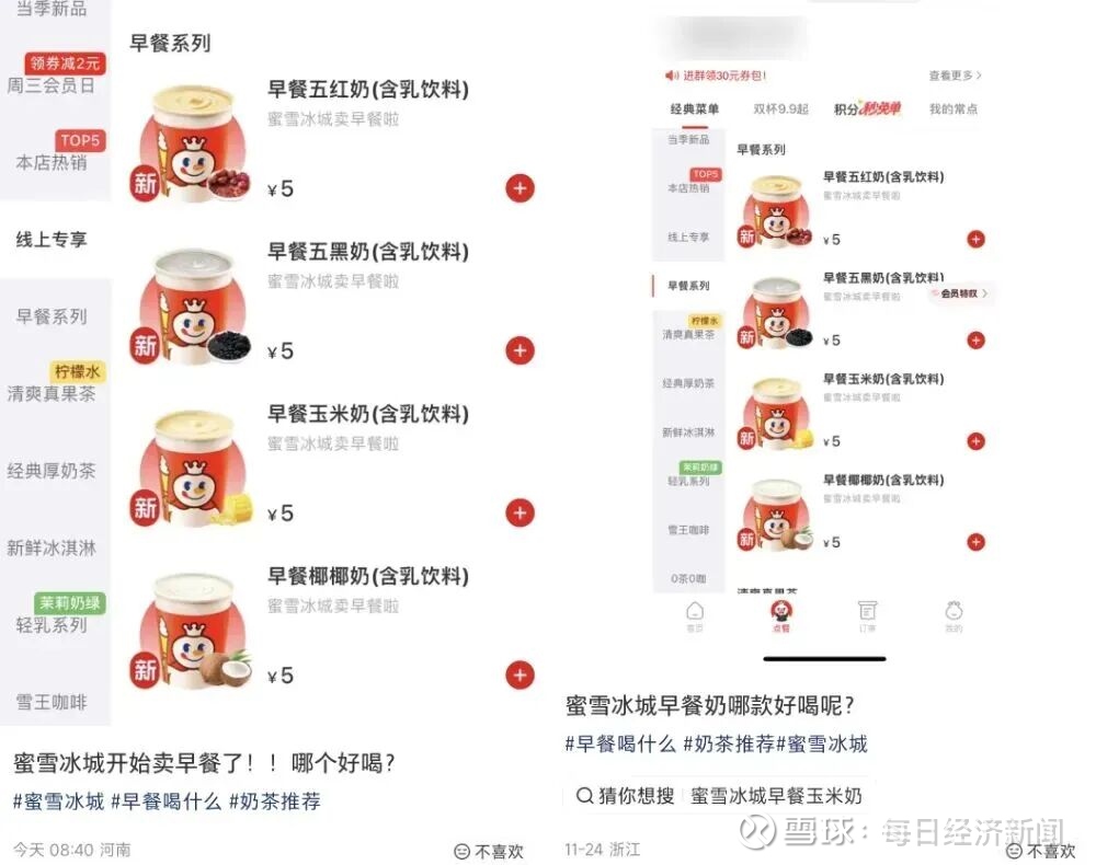 此外,有网友发帖称,蜜雪冰城已开始上新“早餐奶”,在官方小程序点单界面新增“早餐系列”,涵盖早餐五红奶、五黑奶、玉米奶等数款产品,均售价5元。