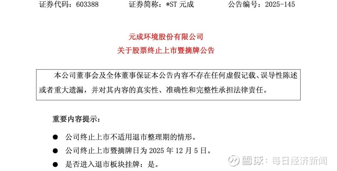 11月28日,*ST元成(603388.SH)公告称,公司于11月28日收到上交所出具的《关于元成环境股份有限公司股票终止上市的决定》,上交所决定终止公司股票上市。公司终止上市暨摘牌日为2025年12月5日。
