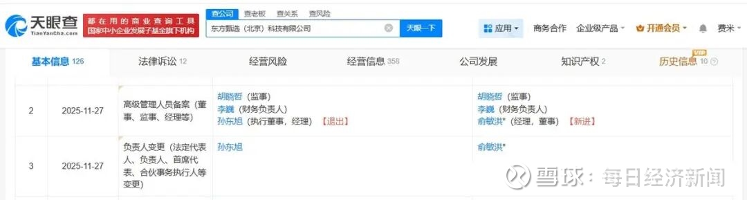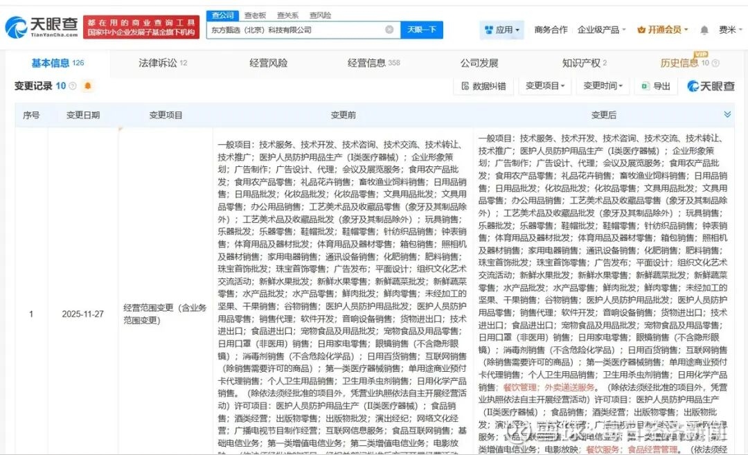 天眼查工商信息显示,近日,东方甄选(北京)科技有限公司发生工商变更,孙东旭卸任法定代表人、执行董事、经理,俞敏洪接任法定代表人、经理,并担任董事。同时,该公司经营范围新增餐饮管理、外卖递送服务、餐饮服务等。东方甄选(北京)科技有限公司成立于2021年12月,注册资本1000万元人民币,经营范围包括企业形象策划、会议及展览服务、食用农产品批发等。股东信息显示,该公司由东方优选(北京)科技有限公司全资持股。