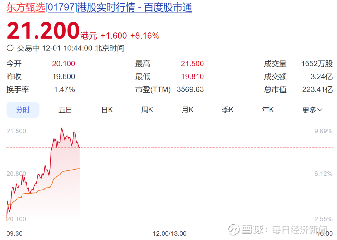 市场方面,港股东方甄选大涨。截至发稿涨超8%,报21.2港元/股,最新市值223亿港元。
