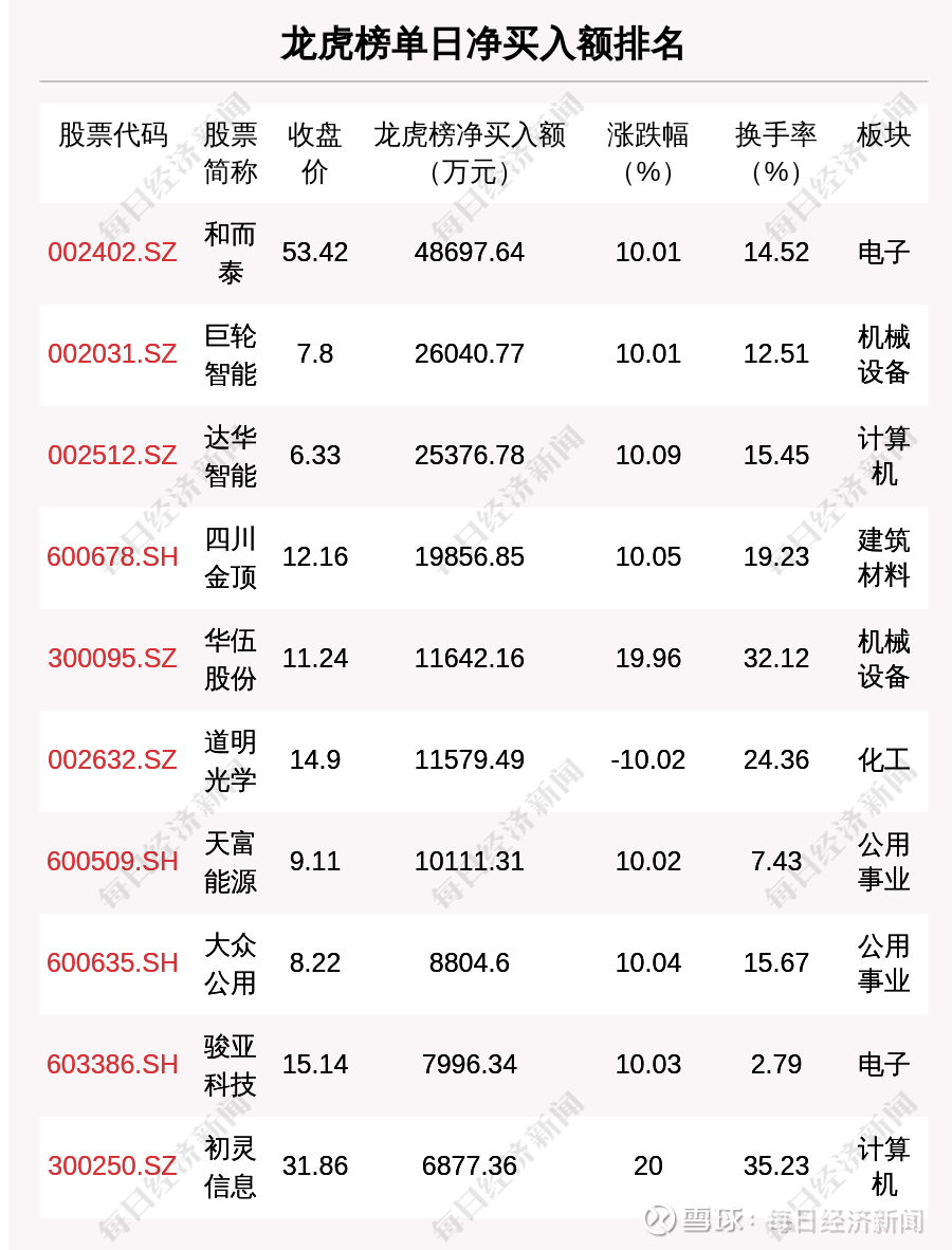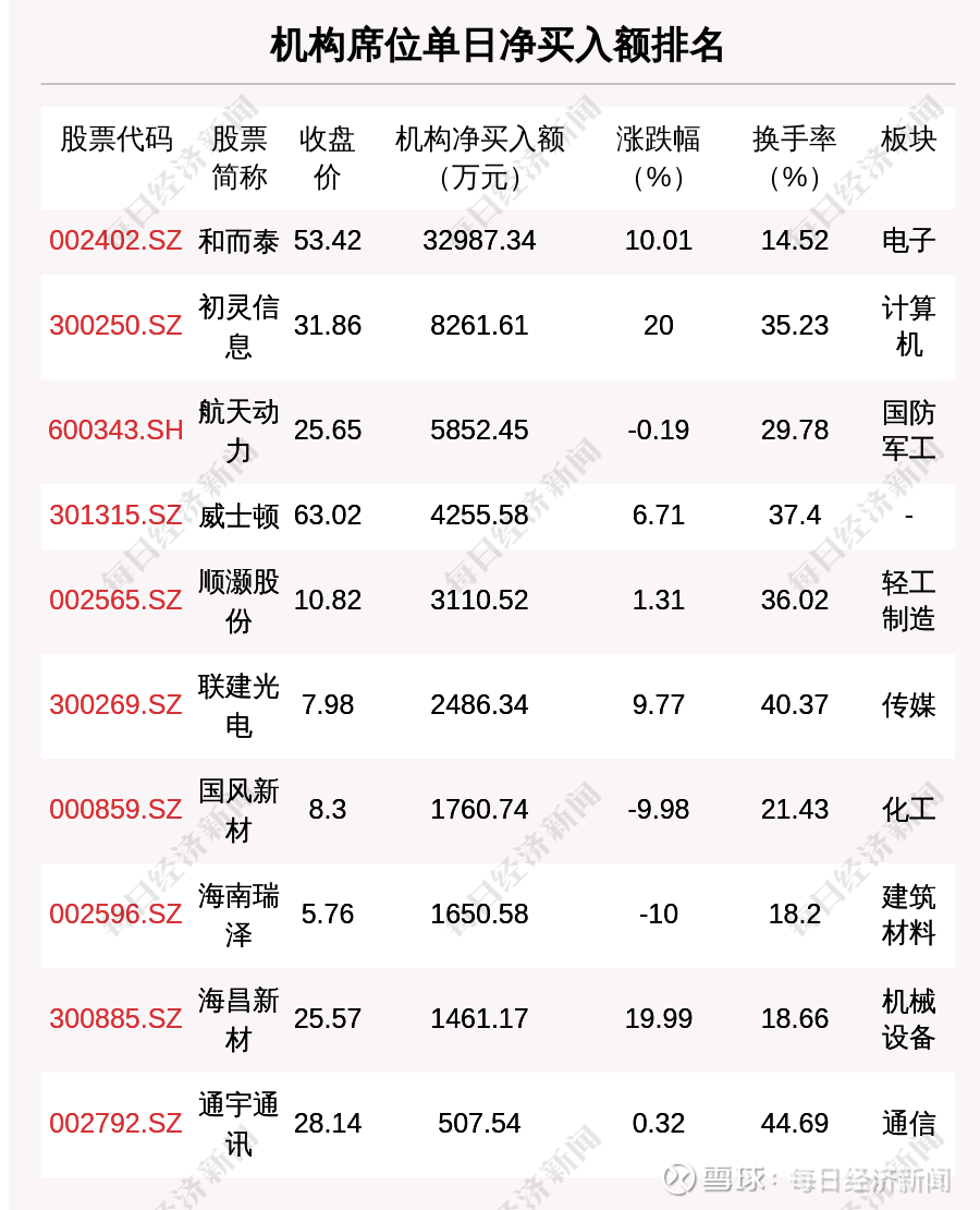 在龙虎榜中,涉及机构专用席位的个股有24只,净买入额前三的是和而泰、初灵信息、航天动力,分别为3.3亿元、8261.61万元、5852.45万元。