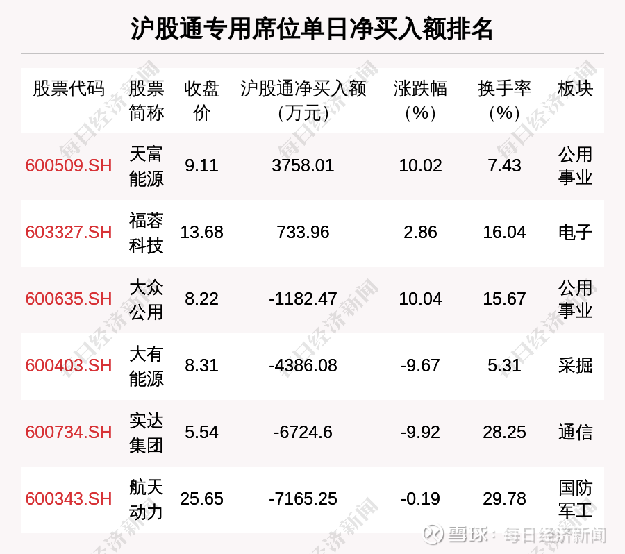在龙虎榜中,涉及沪股通专用席位的个股有6只,天富能源的沪股通专用席位净买入额最大,净买入3758.01万元。