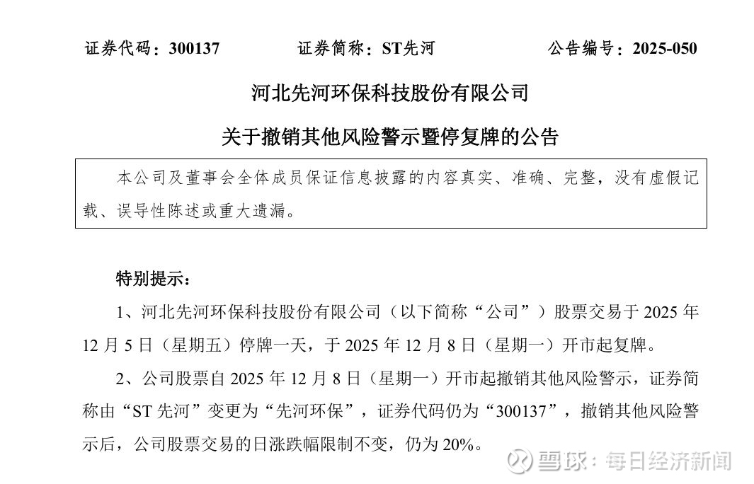 公告显示,公司股票交易于2025年12月5日(星期五)停牌一天,于2025年12月8日(星期一)开市起复牌。公司股票自2025年12月8日(星期一)开市起撤销其他风险警示,证券简称由“ST先河”变更为“先河环保”,证券代码仍为“300137”,撤销其他风险警示后,公司股票交易的日涨跌幅限制不变,仍为20%。