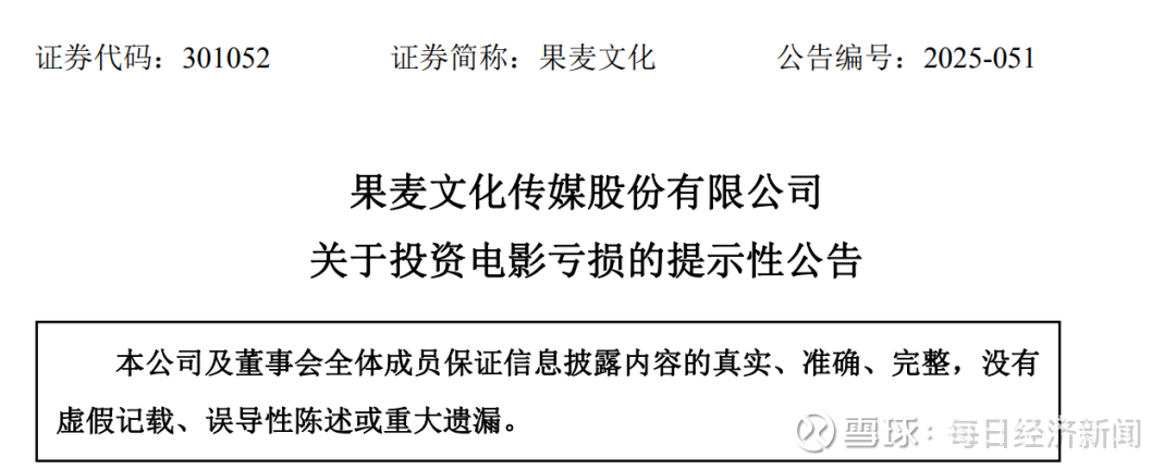 公司表示,因《三国的星空第一部》票房未达预期,公司初步测算投资该电影亏损金额约为4000万元,该亏损规模占公司2024年度经审计净利润的10%以上,且绝对金额超100万元。