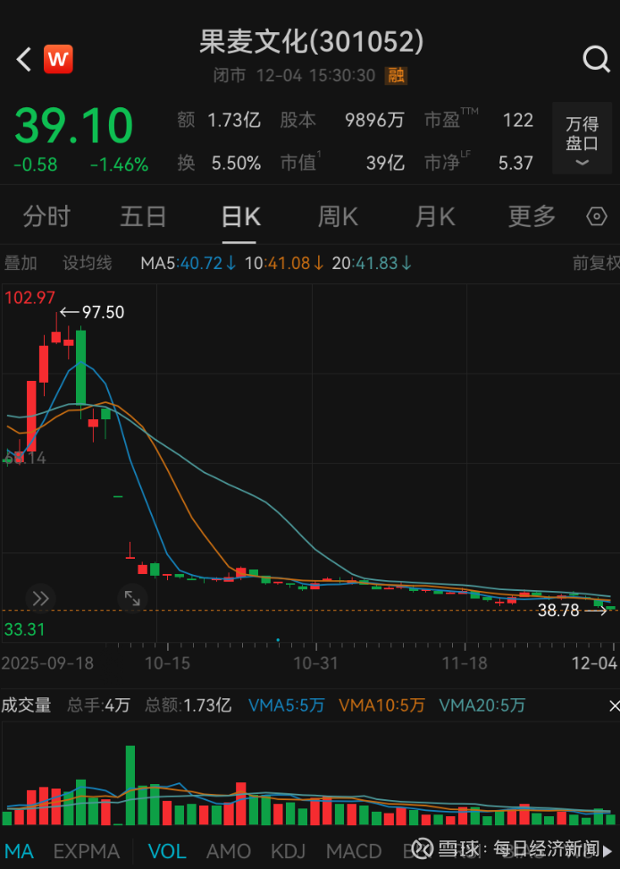 而在公司12月2日发布亏损公告后,公司股价连续两个交易日下跌。截至12月4日,果麦文化收盘报39.1元/股,总市值已跌至39亿元。