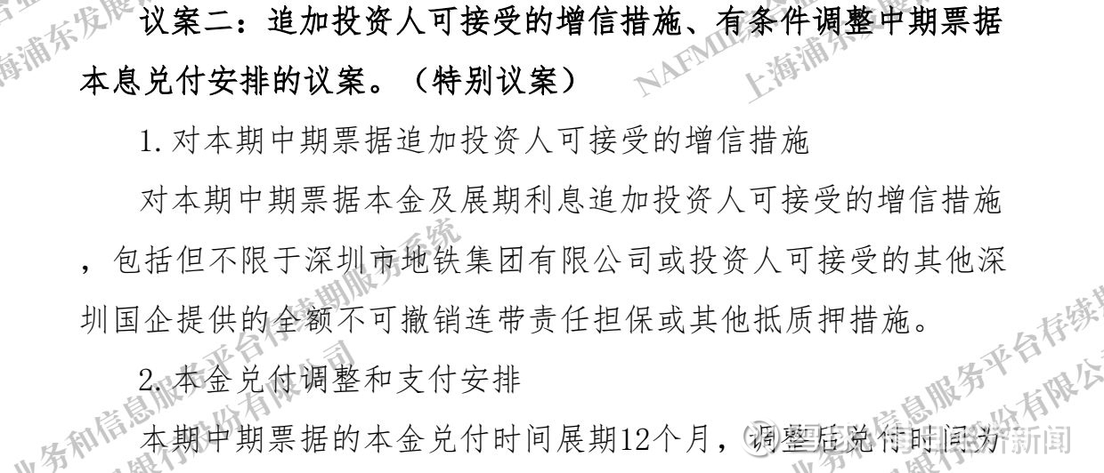 其中,议案二明确了增信措施的核心方向:对本期中期票据本金及展期利息追加投资人可接受的增信措施,包括但不限于深圳市地铁集团有限公司或投资人可接受的其他深圳国企提供的全额不可撤销连带责任担保或其他抵质押措施。此外,议案还约定,万科在偿付后续到期债券前,需优先兑付本期票据本息。