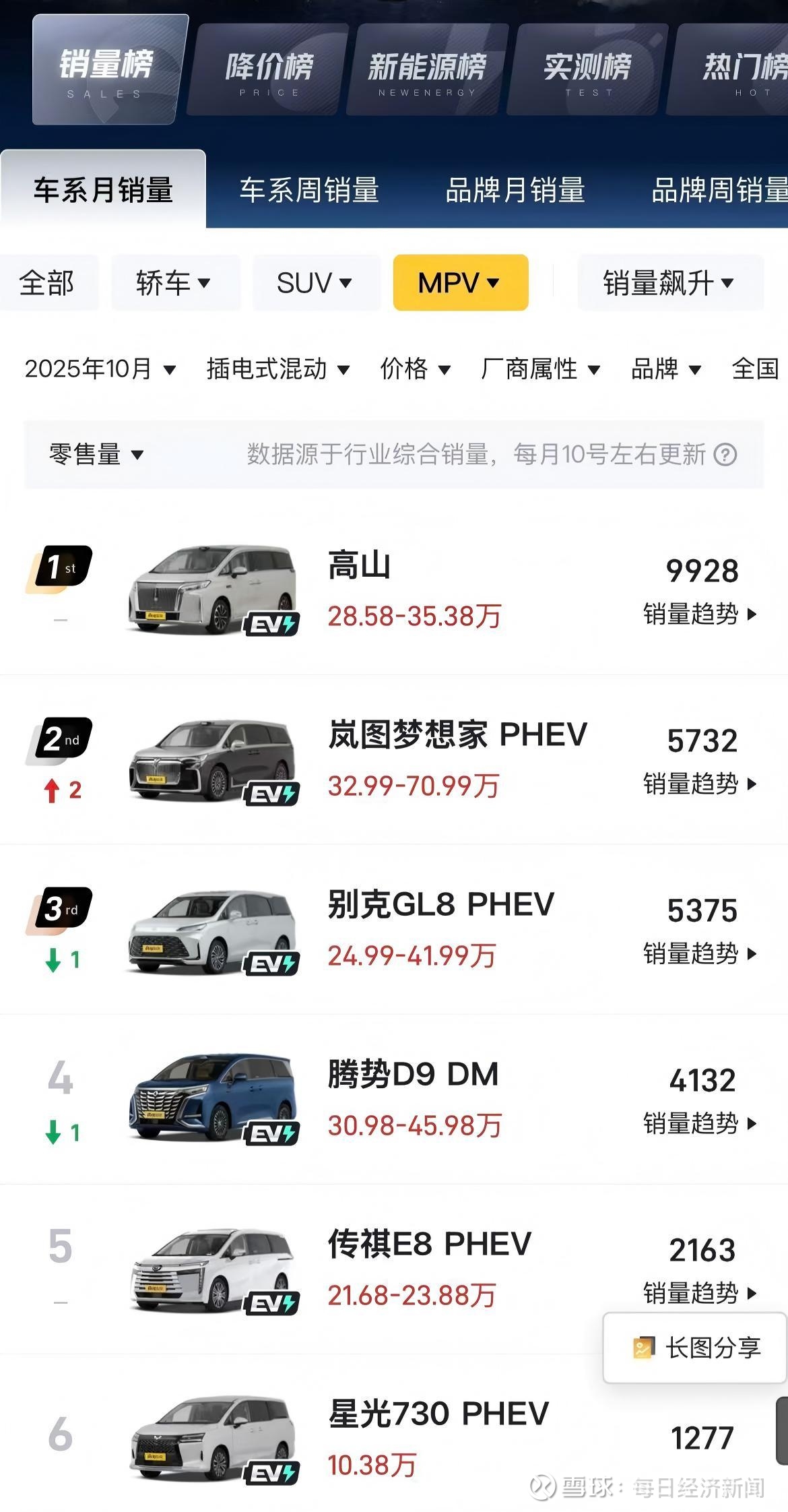 其中,自主品牌新能源MPV的表现颇为亮眼。从第三方10月数据来看,在插混MPV市场中,魏牌高山(28.58万~35.38万元)销量9928辆,岚图梦想家PHEV(32.99万~70.99万元)销量5732辆,别克GL8 PHEV(24.99万~41.99万元)销量为5375辆,自主品牌占据了前两名的席位。