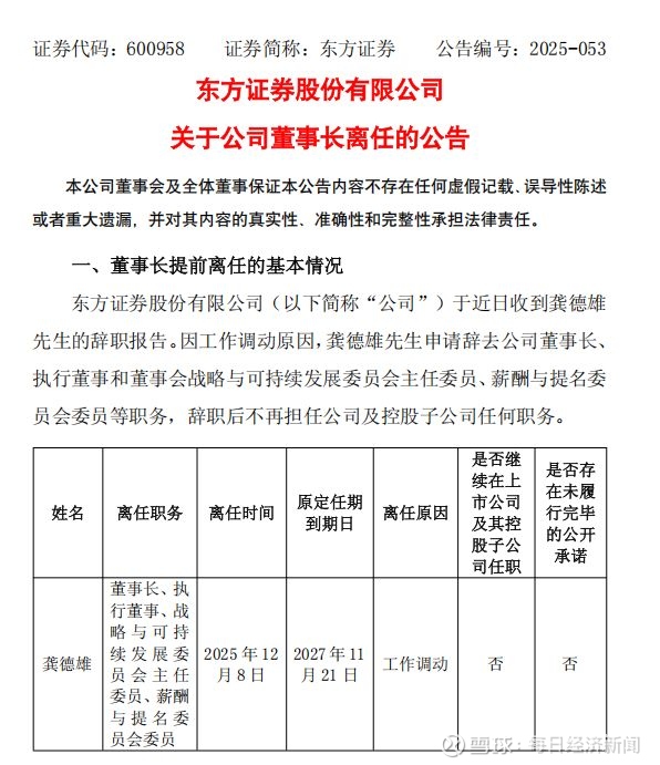 今日收盘后,东方证券发布公告称,"于近日收到龚德雄先生的辞职报告。因工作调动原因,龚德雄先生申请辞去公司董事长、执行董事和董事会战略与可持续发展委员会主任委员、薪酬与提名委员会委员等职务,辞职后不再担任公司及控股子公司任何职务。"此次离任距离龚德雄2024 年11月正式就任董