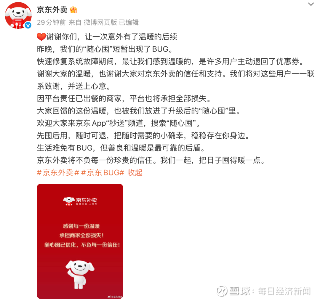 谢谢你们,让一次意外有了温暖的后续昨晚,我们的“随心囤”短暂出现了BUG。快速修复系统故障期间,最让我们感到温暖的,是许多用户主动退回了优惠券。谢谢大家的温暖,也谢谢大家对京东外卖的信任和支持。我们将对这些用户一一联系致谢,并送上心意。