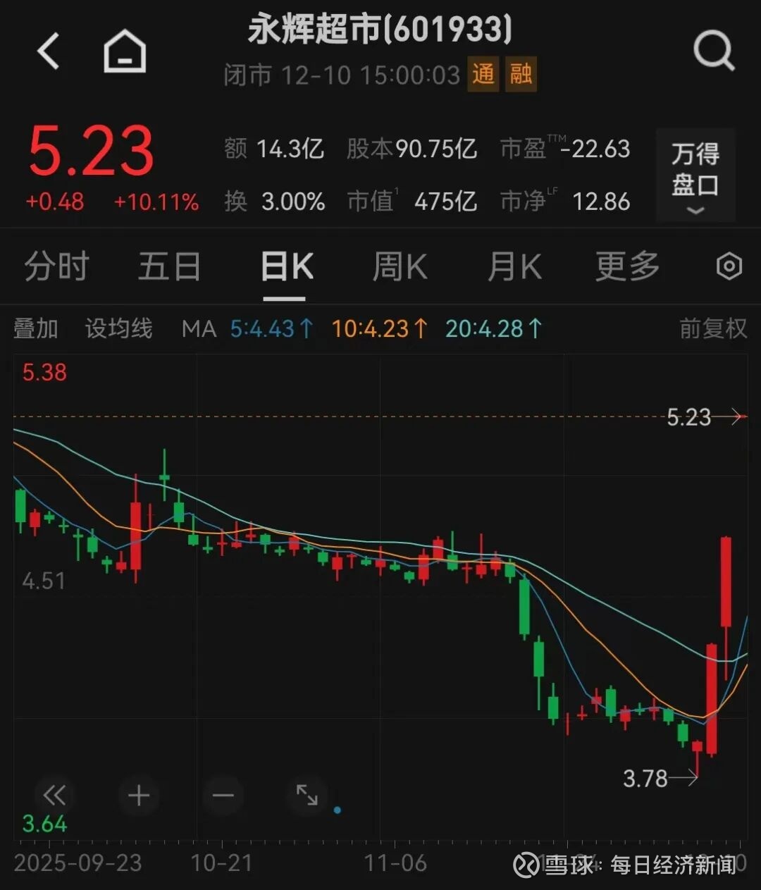 12月10日,永辉超市股价再度涨停,收获三连板,截至收盘,报5.23元,最新总市值475亿元。