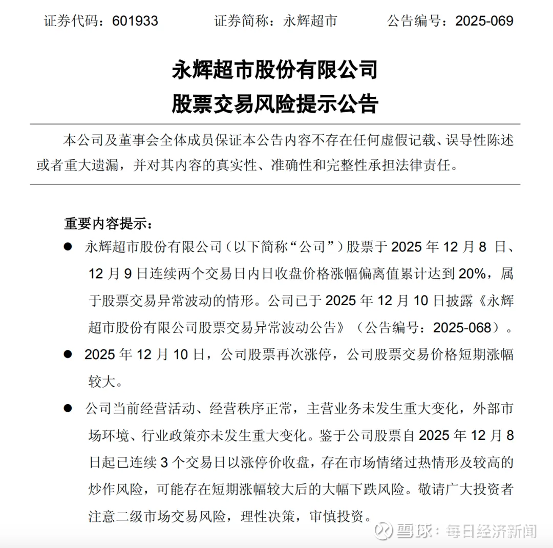 12月10日晚间,永辉超市发布股票交易风险提示公告称,公司股票在12月8日、9日连续两个交易日收盘价格涨幅偏离值累计达到20%。12月10日,公司股票再次涨停,公司股票交易价格短期涨幅较大。