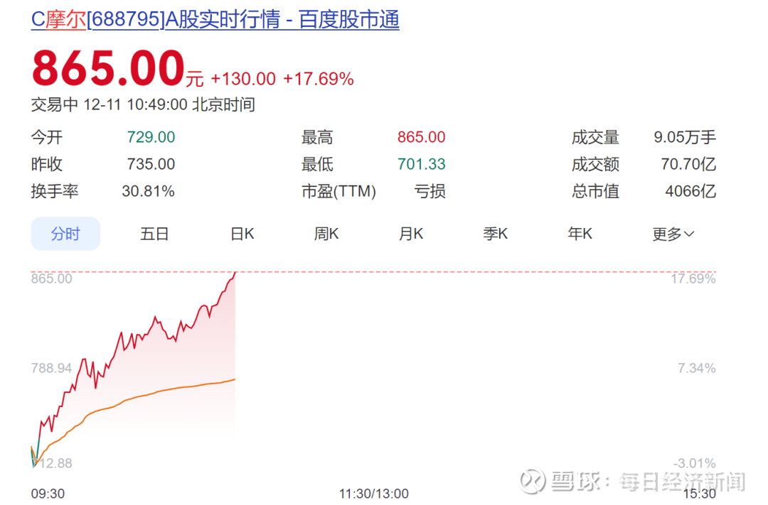 12月11日盘中,摩尔线程股价站上800元关口,再创上市以来新高。截至发稿,该股涨超17%,报865元/股,总市值超4000亿元。
