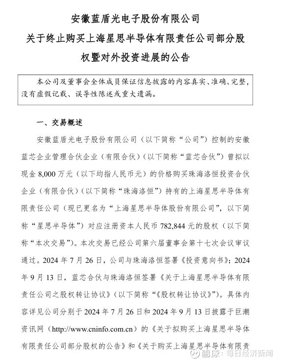 公告显示,蓝盾光电控制的安徽蓝芯企业管理合伙企业(有限合伙)(以下简称“蓝芯合伙”)原拟以现金8000万元的价格购买珠海洛恒投资合伙企业(有限合伙)(以下简称“珠海洛恒”)持有的星思半导体对应注册资本78.28万元的股权。