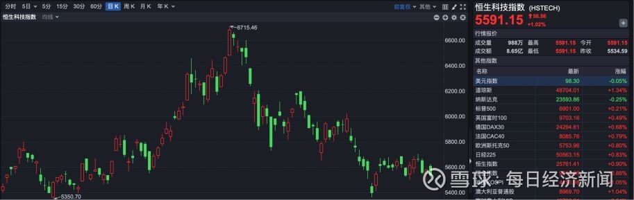 恒生科技指数报5591.15点,上涨56.56点,涨幅1.02%。