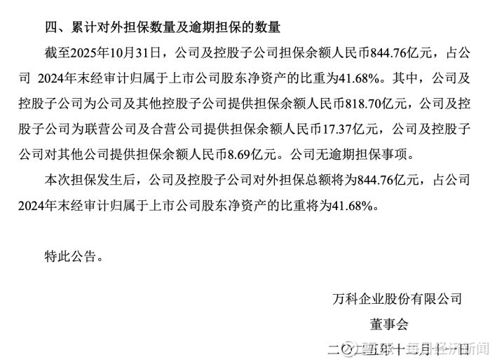 万科公告显示,截至2025年10月31日,公司及控股子公司担保余额844.76亿元,占2024年末经审计归属于上市公司股东净资产比重为41.68%,公司无逾期担保事项。