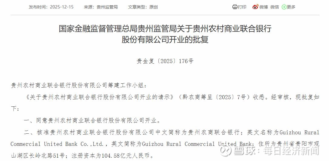 12月15日,国家金融监督管理总局网站发布的信息显示,国家金融监督管理总局贵州监管局已于近日正式作出批复,同意贵州农村商业联合银行股份有限公司(以下简称“贵州农商联合银行”)开业,并核准了贵州农商联合银行的股东构成、业务范围以及董监高任职资格等重要事项。
