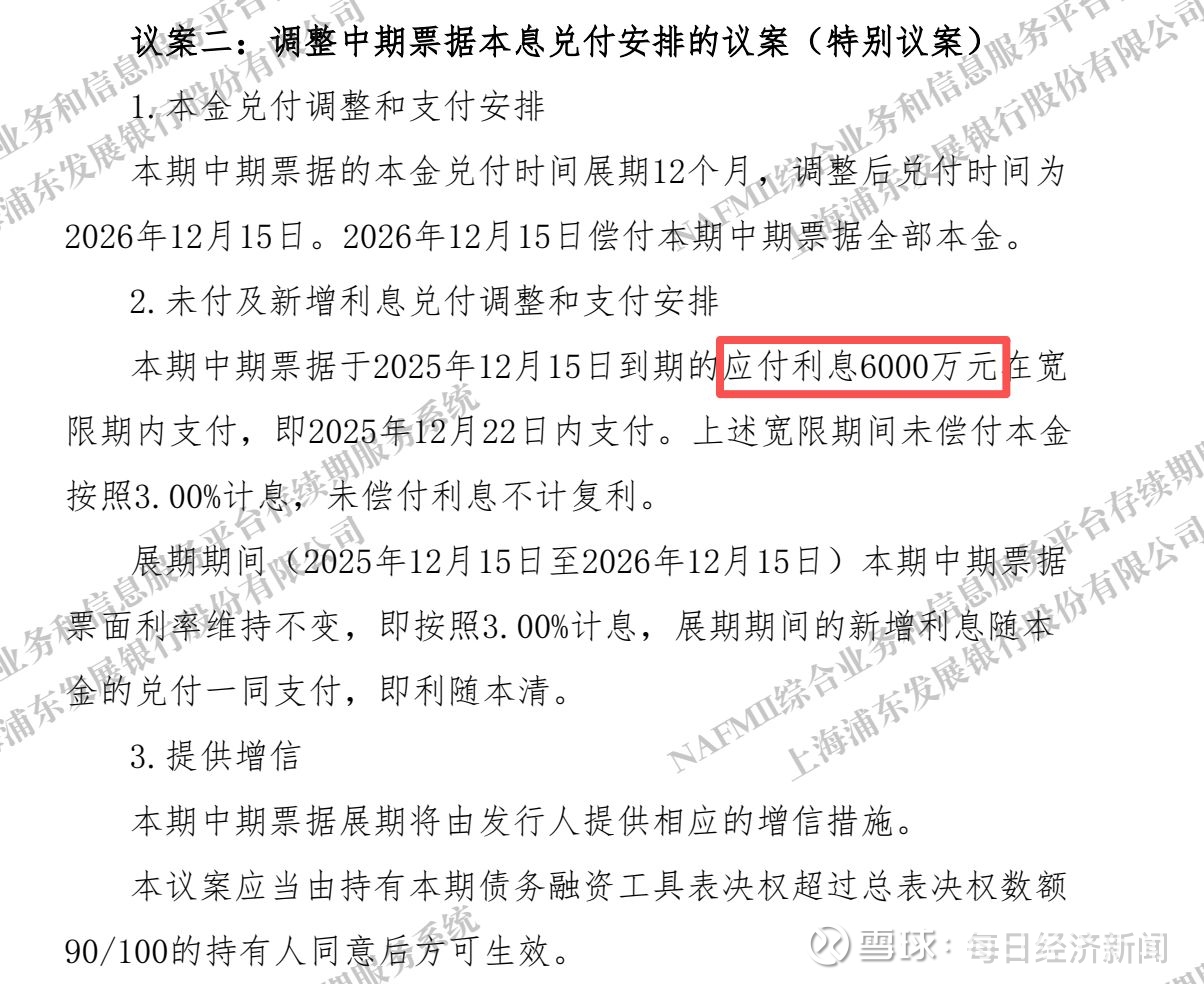 议案二即本息兑付安排,本金兑付时间仍然展期一年,但新增了利息兑付安排。本期中期票据于2025年12月15日到期的应付利息6000万元在宽限期内支付,即2025年12月22日内支付。上述宽限期间未偿付本金按照3.00%计息,未偿付利息不计复利。