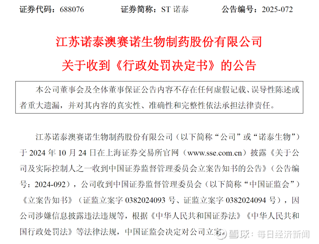 12月17日晚,ST诺泰公告称,公司于近日收到中国证监会下发的《行政处罚决定书》,因存在公开发行文件编造重大虚假内容等违法行为,公司及实际控制人赵德中等6人合计被中国证监会处以7620万元罚款。