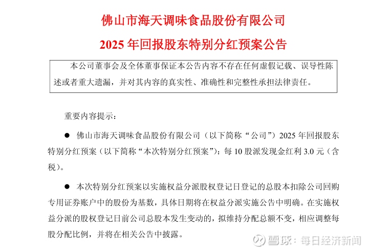 12月18日,海天味业(603288.SH,股价37.01元,市值2165.8亿元)公告称,公司制定未来三年(2025~2027年)股东回报规划,规划指出,公司每年度现金分红总额占当年归属于母公司股东净利润的比例不低于80%。该规划尚需提交股东会审议。同时,公司实行2025年回报股东特别分红预案:每10股派发现金红利3.0元(含税)。