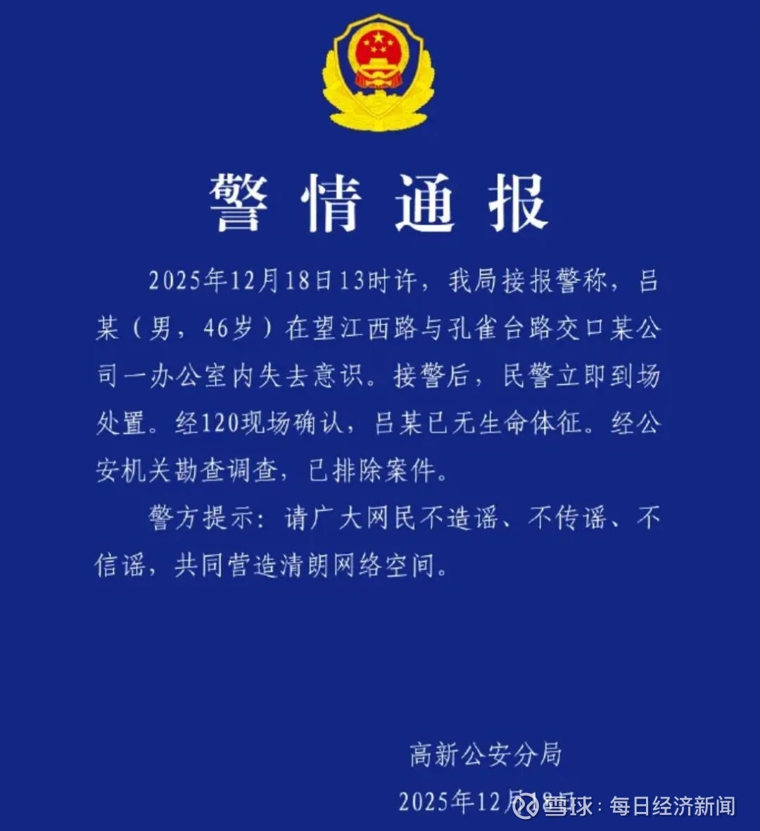 安徽合肥高新警方发布警方通报称,2025年12月18日13时许,我局接报警称,吕某(男,46岁)在望江西路与孔雀台路交叉口某公司一办公室内失去意识。接警后,民警立即到场处置。经120现场确认,吕某已无生命体征。经公安机关勘查调查,已排除案件。