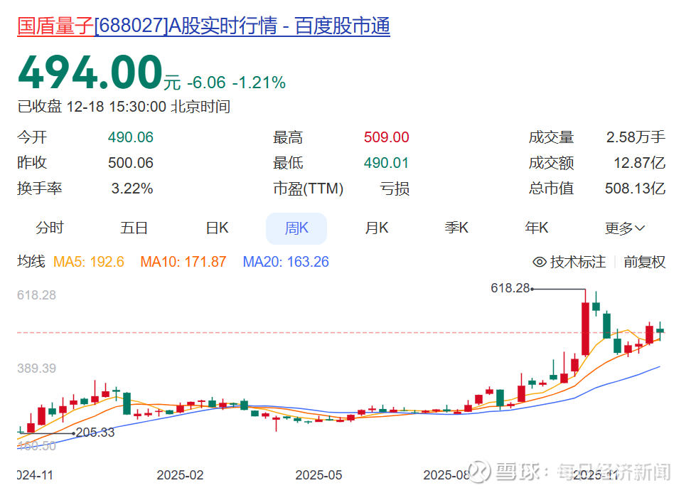 截至18日收盘,国盾量子股价报494元,年内涨超65%,总市值508.13亿元。